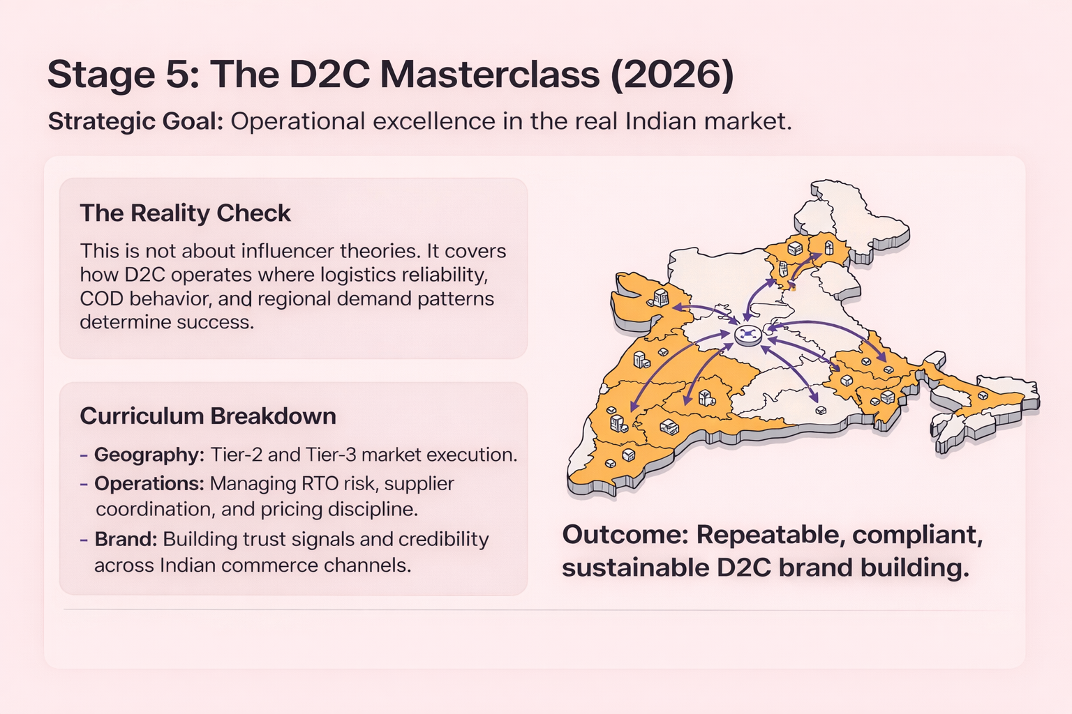 The curriculum addresses Tier-2 and Tier-3 market execution, realistic delivery expectations, RTO risk management, supplier coordination, pricing discipline, and brand credibility across Indian ecommerce channels. The focus is on operational clarity and repeatability, not short-term tactics.
